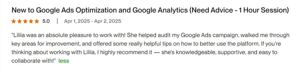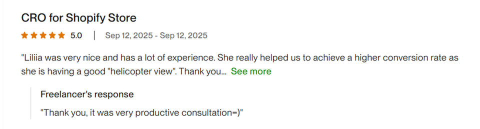 Professional and Reliable Partner. I had the opportunity to work with Liliya on marketing strategy improvements for my business. She conducted a thorough analysis, provided clear and well-structured recommendations, and demonstrated a deep understanding of my goals and needs. All deliverables were prepared on time and with great attention to detail.